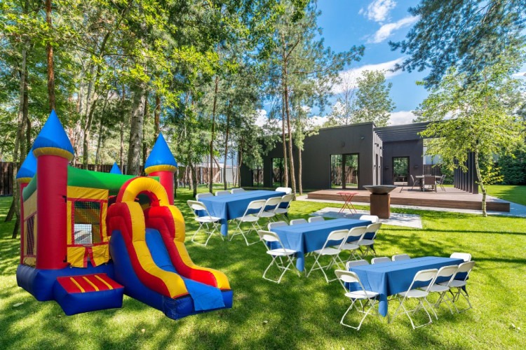 Complete event rental package with a dry bounce house, 3 long tables, and 24 chairs for $360. Taxes and delivery fees not included. Serving Carmel, Indiana, and nearby areas.